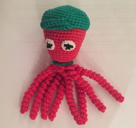 Kareen, à elle seule et en moins d’un an, a crocheté plus de soixante pieuvres, soit la quasi-totalité des besoins du service pour l’année ! Ses pieuvres portent sa signature : une casquette pour les garçons, une charlotte pour les filles. Elles sont réalisées avec du coton aux couleurs chatoyantes et surtout avec amour et cela en fait des objets thérapeutiques aussi jolis que de petites œuvres d’art, toutes uniques …