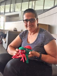 Grand moment d’émotion pour elle puisqu’elle a rencontré Elijah qui a adopté l’une de ses pieuvres : voir ce bébé avec son don, toucher du doigt le sens même de son travail (ses longues heures de crochet) a été un moment très fort en émotion pour elle mais aussi pour nous qui assurons une partie de la logistique du projet.