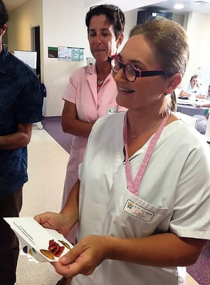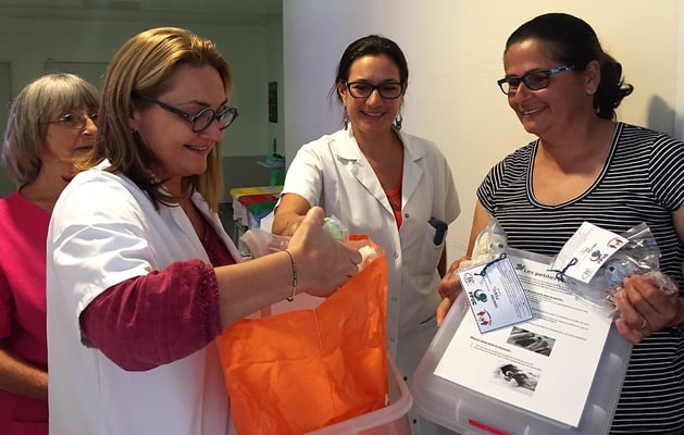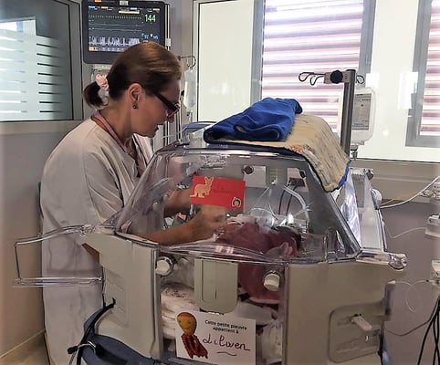 Nous avons été accueillies par Laurence, cadre du service et par Karine, à l’origine du projet, la véritable ambassadrice des Petites Pieuvres Sensation Cocon au cœur du médipôle. Nous avons été heureuses de constater le professionnalisme avec lequel les pieuvres sont contrôlées, lavées à 60° grâce à la machine offerte par notre association, étiquetées, photographiées, stockées sous sachets stériles dans un compartiment adapté avant d’être distribuées selon les besoins identifiés et dans un milieu strictement surveillé. Ce projet est maintenant ancré dans le service de néonatalogie et pour longtemps, nous l’espérons.